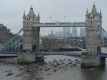 Đoàn thuyền đang đi qua Cầu Tháp London (Tower Brigde) bắc ngang sông Thames.