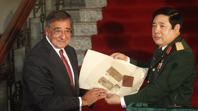 Bộ trưởng Phùng Quang Thanh đã trao cho Bộ trưởng Leon Panetta ba bức thư, những kỷ vật của lính Mỹ trong chiến tranh ở Việt Nam. Bộ trưởng Panetta cũng trao lại cho Bộ trưởng Phùng Quang Thanh cuốn nhật ký của một quân nhân Việt Nam và bày tỏ hi vọng nó sớm được trở về với gia đình người lính ấy - Ảnh: Huy Khâm