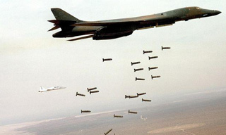 Chiến đấu cơ Mỹ diễn tập thả bom chùm trong môt cuộc tập trận bắn đạn thật - Ảnh: AFP