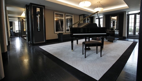 Phòng lễ tân của căn hộ siêu sang được lót thảm mềm và trang bị chiếc đại dương cầm làm điểm nhấn.