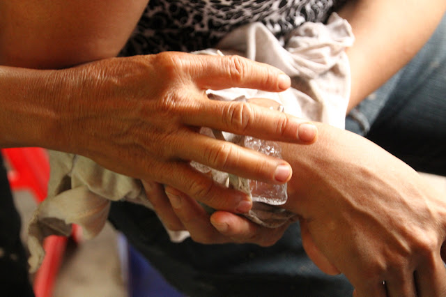Bà con đang cho những người bị đánh đi bệnh viện, bó bột bà chạy chữa viết thương, ảnh và phim quay được đang được bà con mang sang để gửi đăng lên.