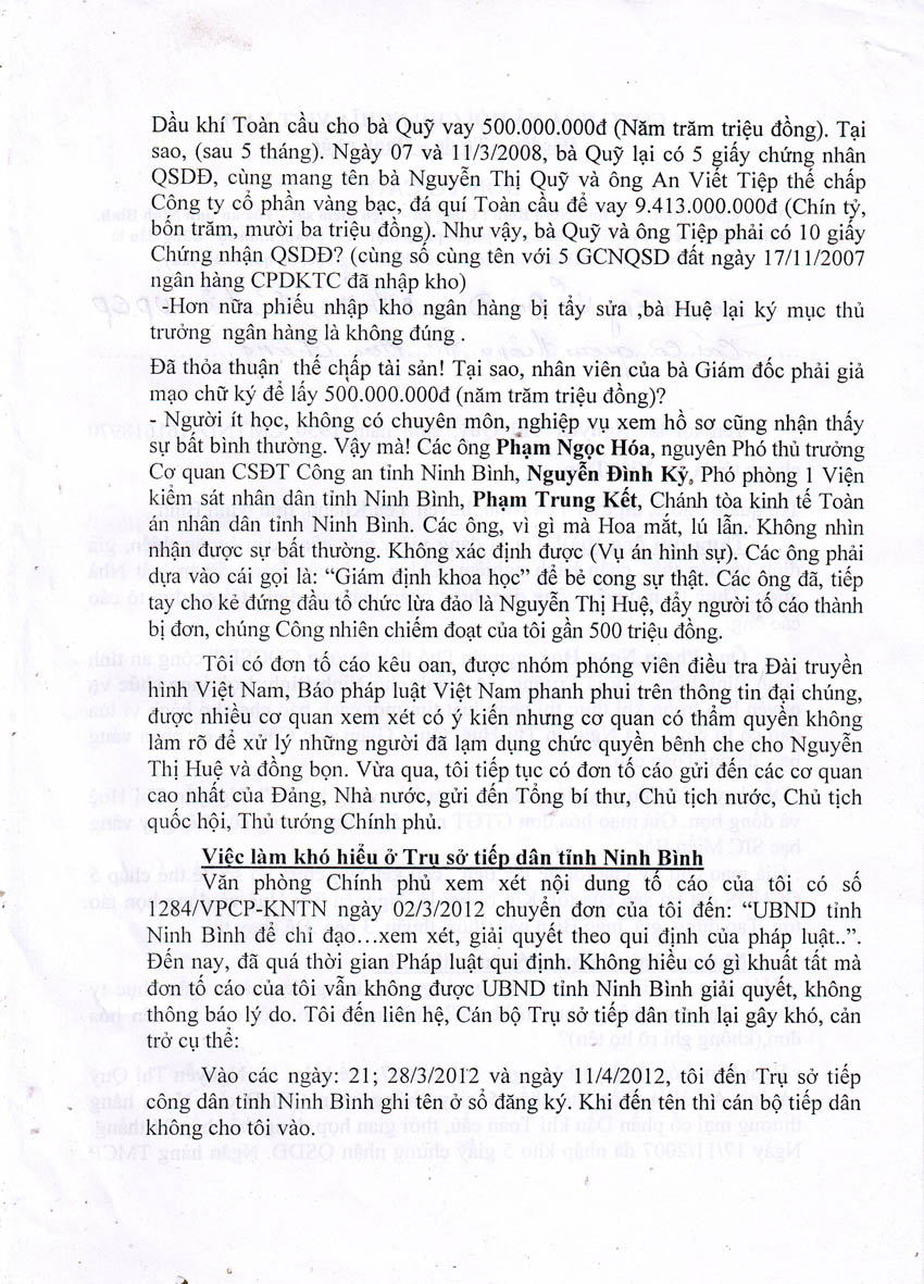 Tôi có đơn tố cáo kêu oan, được nhóm phóng viên điều tra Đài truyền h́nh Việt Nam, Báo pháp luật Việt Nam phanh phui trên thông tin đại chúng, được nhiều cơ quan xem xét có ư kiến nhưng cơ quan có thẩm quyền không làm rơ để xử lư những người đă lạm dụng chức quyền bênh che cho Nguyễn Thị Huệ và đồng bọn. Vừa qua, tôi tiếp tục có đơn tố cáo gửi đến các cơ quan cao nhất của Đảng, Nhà nước, gửi đến Tổng bí thư, Chủ tịch nước, Chủ tịch quốc hội, Thủ tướng Chính phủ.