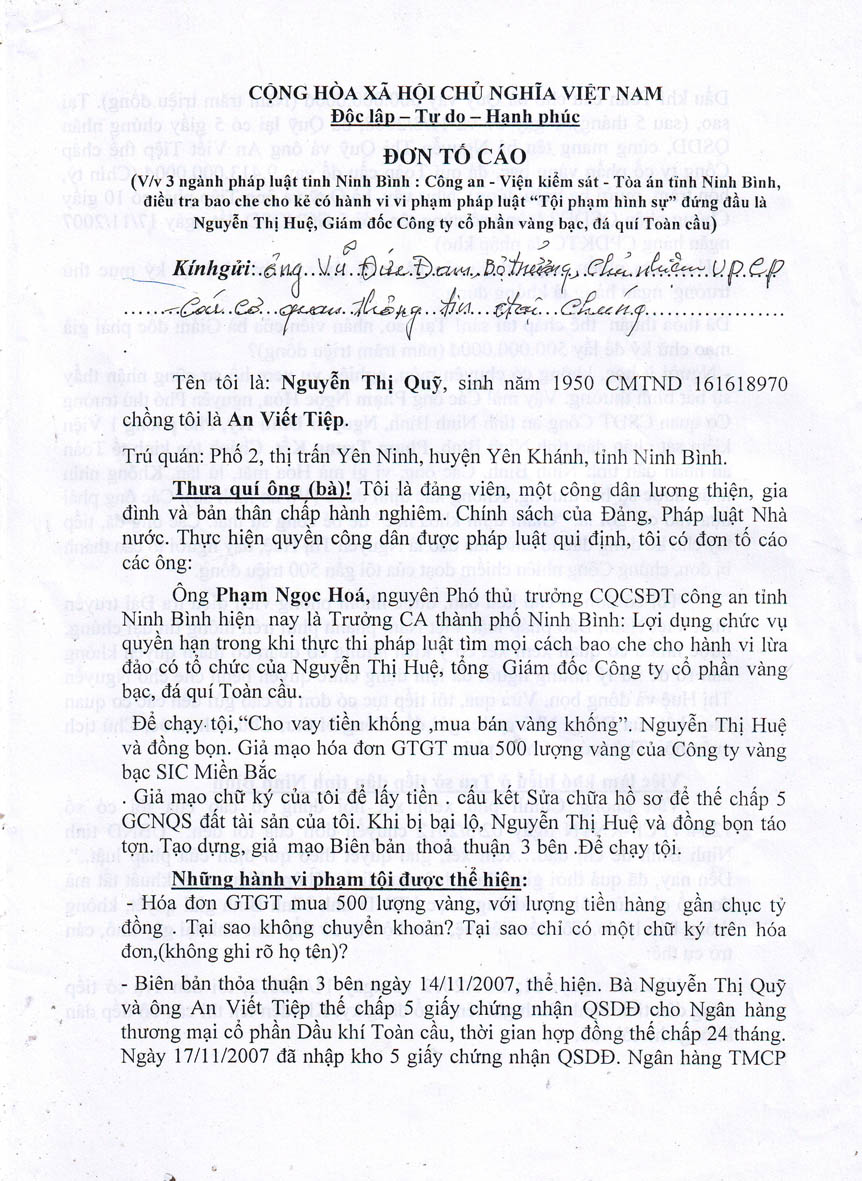 Trưởng CA thành phố Ninh B́nh: Lợi dụng chức vụ quyền hạn trong khi thực thi pháp luật t́m mọi cách bao che cho hành vi lừa đảo có tổ chức của Nguyễn Thị Huệ, tổng Giám đốc Công ty cổ phần vàng bạc, đá quí Toàn cầu.