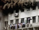 Những người bị mắc kẹt sơ tán ra ban công. Vụ hoả hoạn đă thiêu rụi hàng ngh́n tài liệu nhạy cảm, máy tính…
