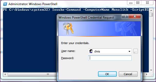 Invoke-Command -ComputerName Monolith -ScriptBlock { Get-ChildItem C:\ } -credential chris