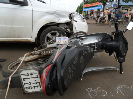 Vụ tai nạn hy hữu trên xảy ra khoảng 15 giờ ngày 29/6, tại ngã ba đường Nguyễn Tất Thành giao với đường Lý Tự Trọng (TP Buôn Ma Thuột, Đắk Lắk). Theo các nhân chứng cho biết, vào thời điểm trên xe máy BKS 47FE - 7426 do anh Nguyễn Hữu Dương (35 tuổi, phường Tân An, TP Buôn Ma Thuột, Đắk Lắk) cầm lái đang lưu thông trên đường Nguyễn Tất Thành với tốc độ cao; khi đến đoạn đường trên bất ngờ đâm vào ô tô 4 chỗ BKS 47A - 007.93.