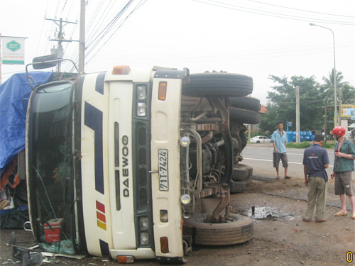 (TNO) Sáng nay 1.7, xe tải mang biển số 71T-7424 chở nước ngọt, mì tôm lưu thông trên QL1A theo hướng từ TP.HCM đi Bình Thuận, khi đến trước trạm xăng dầu 35, P.Phú Bình, TX.Long Khánh (Đồng Nai) bất ngờ bị lật nhào (ảnh).