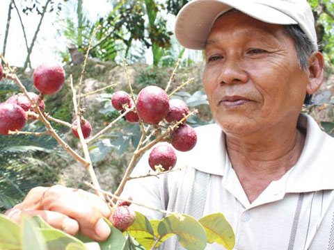 | Ông Bảy Huy bên chùm nhãn tím còn non. |