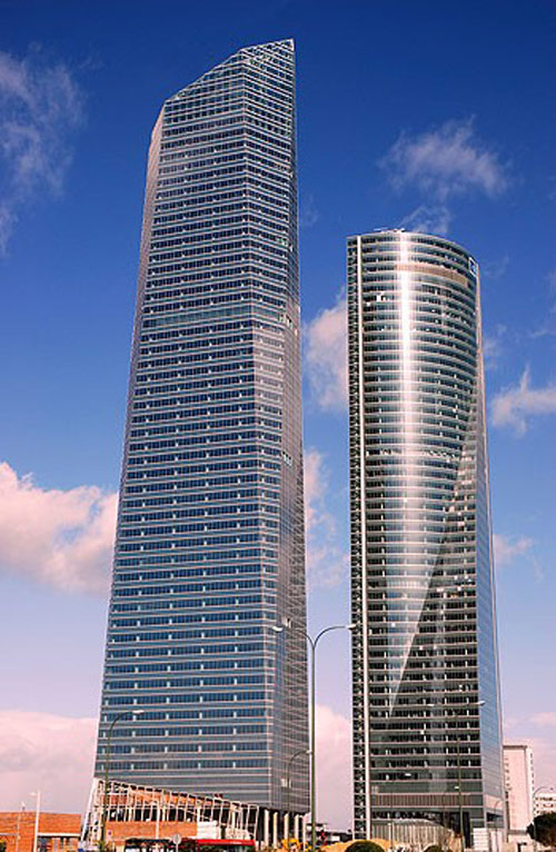 Tháp Torre Caja (trái) cũng nằm trong Khu thương mại Cuatro Torres ở Madrid. Với chiều cao 250 mét và 45 tầng, đây là ṭa nhà cao nhất trong 4 ṭa nhà ở khu tổ hợp Cuatro Torres và cao nhất Tây Ban Nha. Đây là công tŕnh do kiến trúc sư nổi tiếng Norman Foster thiết kế và hoàn thành trong năm 2008.