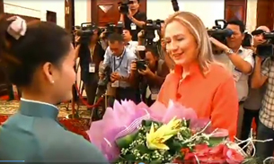 Bà Clinton nhận hoa tặng trước buổi họp báo ở Hà Nội