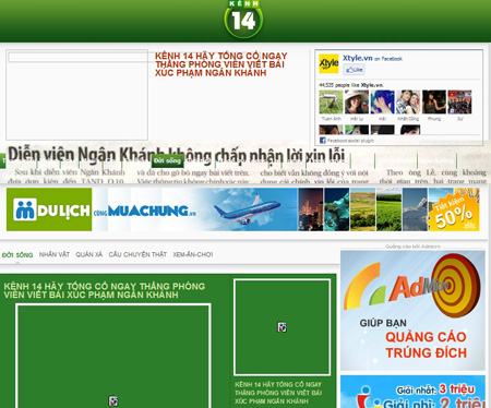Thêm vào đó, nếu để ý sẽ thấy trên giao diện trang Kênh 14 là liên tiếp các hình chụp lại đoạn thông tin về việc “Diễn viên Ngân Khánh không chấp nhận lời xin lỗi” đã từng được báo Tuổi trẻ đăng tải cách đây 1 tuần.
