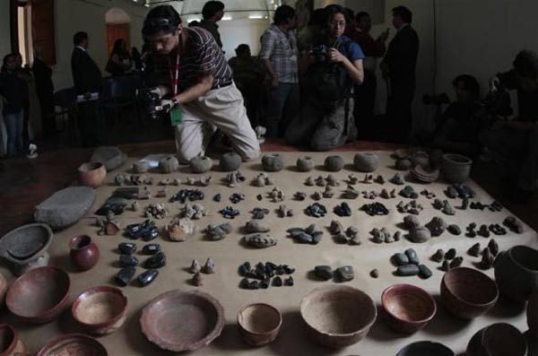 Các phóng viên đang chụp h́nh các cổ vật ở thành phố Guatemala (Guatemala) hôm 13/6. Theo các nhà chức trách, họ phát hiện ra 440 cổ vật năm 2008 sau khi chúng bị bán cho một cửa hàng đồ cổ tại Chichicastenango, thuộc khu vực Quiche, phía Bắc của đất nước.