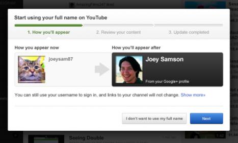 Nói về việc chuyển đổi này, trên blog của YouTube, kỹ sư phần mềm John Fisher cho biết: “Đây là danh tính của bạn, v́ vậy bạn đang là người chủ động. Đầu tiên, tên của bạn. Nếu trên YouTube bạn dùng tên joeysam87, bây giờ bạn có thể xuất hiện với tư cách là Joey Samson, tên đầy đủ từ hồ sơ cá nhân Google+ của bạn, cùng với h́nh ảnh đại diện bất kỳ nào đó.