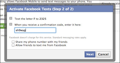 Hệ thống sẽ gửi mã xác nhận vào chú dế, bạn hãy điền nó vào ô trống. Bạn được quyền tùy chọn chia sẻ số điện thoại với mọi người (Share your number) hoặc cho phép bạn bè nhắn tin vào di động qua Facebook (Allow friends to text me from Facebook).