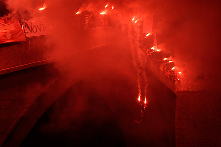 Một người đàn ông cầm đuốc nhảy từ cây cầu cổ Mostar xuống dòng sông Neretva trong một sự kiện nhảy cầu đêm được tổ chức hàng năm ở Mostar, Bosnia.