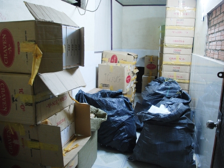 Kho chứa thuốc lá lậu bị cơ quan chức năng phát hiện.