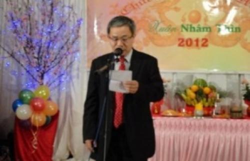 Ông Lê Thiết Hùng cầm giấy đọc lời chúc Tết bà con. Ảnh Đàn Chim Việt.