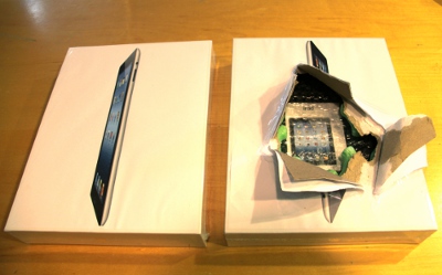 Hộp iPad còn bảo đảm (trái) và hộp được mở phía trước để khách hàng nhìn vào. (Hình: Ngọc Lan/Người Việt)