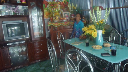 Chúng tôi dừng lại ở một ngôi nhà quay lưng lại với dòng sông. Từ trước cửa nhìn vào, trên chiếc bàn thờ mới lập vẫn đang nghi ngút khói hương. Mẹ của nạn nhân là bà H. đang ngồi trên võng nhìn di ảnh của con với đôi mắt đỏ hoe, vô hồn. Cạnh đó, cô con dâu của bà cũng đang ngồi ủ rũ dưới nền gạch lạnh giá, dỗ dành đứa con nhỏ. Không khí tang thương vẫn còn hiển hiện trong ngôi nhà và thân nhân của người đã khuất. Còn gì đau đớn hơn khi người đầu bạc phải tiễn kẻ đầu xanh.