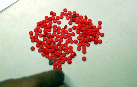 Quả nhiên, trong 2 chiếc mũ lưỡi chai của hai người này có chứa một bọc dài màu đen được khâu kín trong vành mũ. Tổ công tác đã tiến hành gỡ ra và phát hiện có 61 viên thuốc màu đỏ và 2 viên màu xanh (nghi là hồng phiến, hay còn được “dân bay” gọi là “ngựa”).