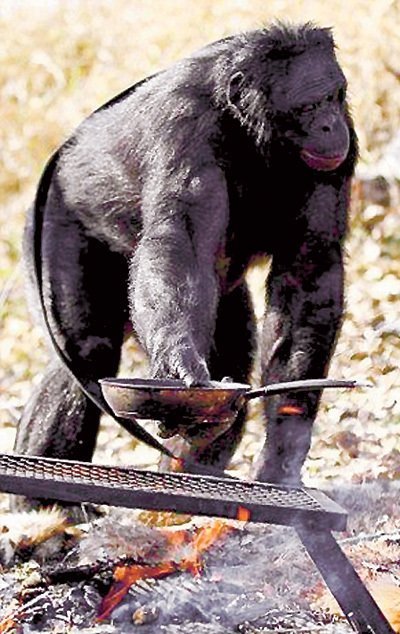 Rồi một tháng sau, chính con linh trưởng này đã học được cách đánh lửa và nấu ăn cho mình trên cái chảo. Biết đâu khi mời khách, Kanzi lại chẳng thết bạn một món rán nào đó. Còn bây giờ thì nó đang dạy cho đồng loại cách làm chín thức ăn và cả bầy đã thưởng thức một món ăn chín do chúng tự nấu.