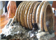Dựa vào lớp xỉ kết dính vào rạn san hô trên chồng tô men nâu, các chuyên gia nhận định nhiều khả năng con tàu chứa cổ vật đă bị cháy trước khi bị ch́m đắm ở vùng biển xă B́nh Châu, huyện B́nh Sơn. Ảnh: Trí Tín.