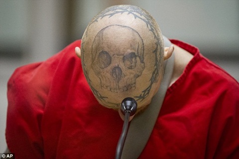 Hình ảnh đẹp nhất hôm nay là người đàn ông với hình xăm đầu lâu trên đỉnh hộp sọ chẳng khác gì người hai đầu ở tòa án sau khi bị kết tội ăn cắp xe.