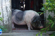 Vừa dựng xe máy xuống, chúng tôi đã giật mình bởi một con heo mọi (có nơi gọi là lợn Móng Cái), khoảng hơn 100kg đang nằm ngủ bỗng dưng bật dậy nhe nanh “đứng tấn” trước cửa và tỏ vẻ “hung hăng” ngăn cản không cho người lạ vào nhà.