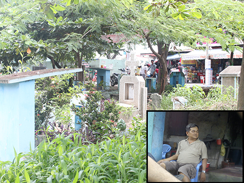 Ông Hai Kẹo (ảnh nhỏ) và khu đất nghĩa trang do ông “quản lý”