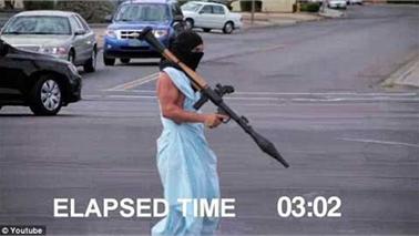 Một nhà làm phim không chuyên đã bị bắt sau khi quay phim cháu trai ăn mặc như một tên khủng bố, chĩa súng phóng lựu giả vào xe cộ đi trên đường để thử phản ứng của cảnh sát.