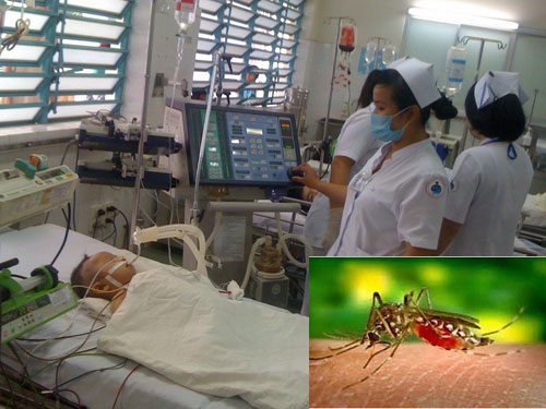 Ảnh lớn: Bệnh nhi sốt xuất huyết đang điều trị tại Bệnh viện Nhi Đồng 1 - TPHCM. Ảnh nhỏ: Muỗi hổ châu Á .Ảnh: NGUYỄN THẠNH - INTERNET