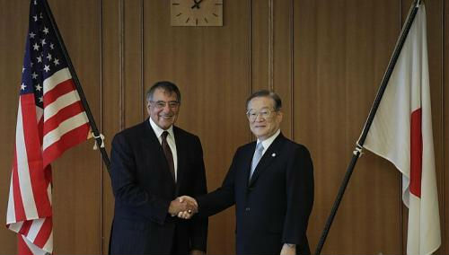 Bộ trưởng quốc phòng Mỹ Leon Panetta (trái) bắt tay người đồng nhiệm Nhật Bản Satoshi Morimoto tại Bộ quốc phòng Nhật hôm 17/9.