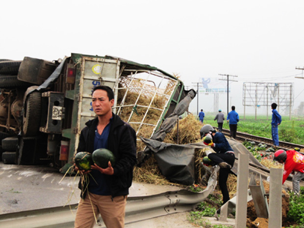 Người dân tranh thủ "hôi" dưa hấu sau khi chủ xe gây tai nạn ngày 14/04/2011. Ảnh: SGTT
