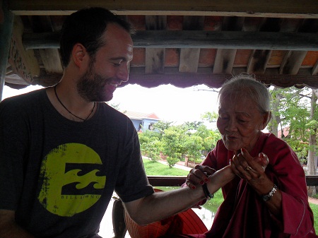Cụ Diều đang xem chỉ tay cho du khách bằng tiếng Anh