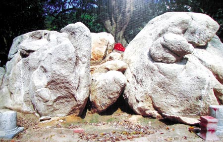| Khối đá tròn nằm ở vị trí trên cùng của khối "Thạch Mẫu" chính là đầu. Khối đá phía dưới là bầu ngực. Giữa hai đầu gối có hai khối đá tượng trưng cửa bát nhã (nơi sinh nở của phụ nữ) và bào thai đang chào đời. |