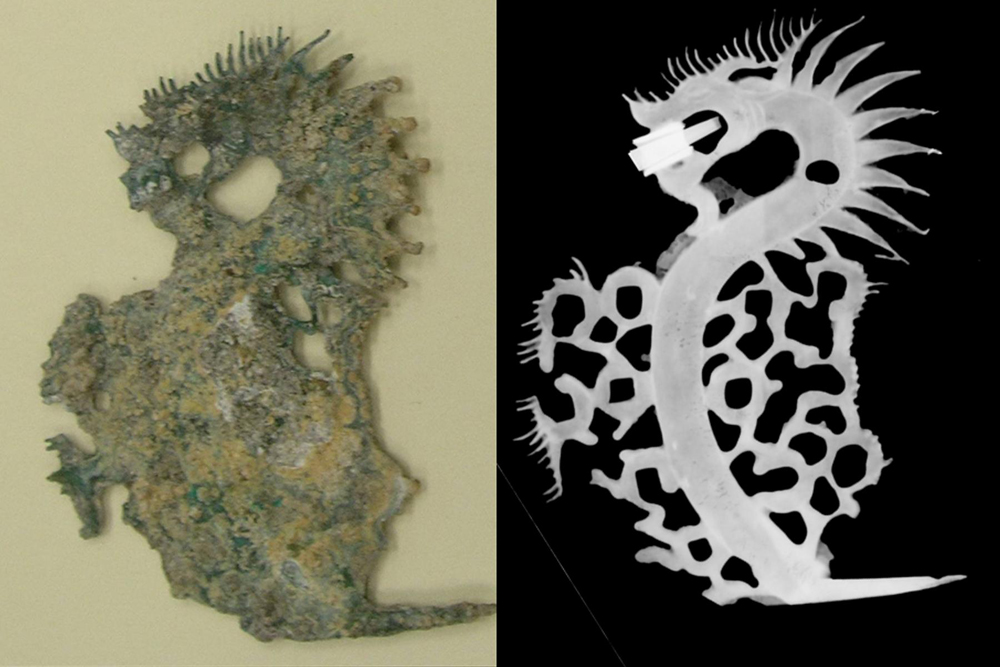 Các nhà khoa học đã xác định được hình ảnh của cây tiền (hình rồng bên phải) nhờ sử dụng kĩ thuật X-radiography.