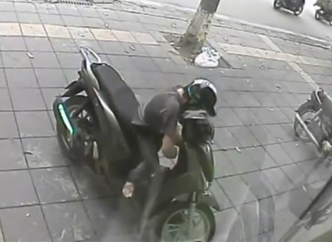 Vụ trộm xảy ra vào lúc 12h20 ngày 7/10 tại một hàng bán đồ thể thao trên đường Trần Duy Hưng, Hà Nội. Người quản lư cửa hàng cho biết: " Chiếc SH màu đen của một vị khách vừa vào cửa hàng không lâu. Khi quan sát qua màn h́nh camera chúng tôi phát hiện một thanh niên đang cố gắng phá khóa".