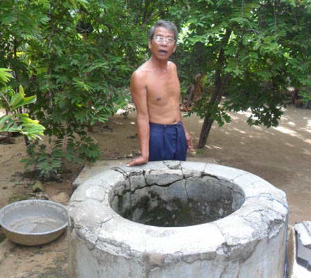 | Ông Dự bên giếng cổ 200 tuổi của nhà mình. |
