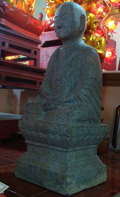 Sư thầy Thích Đàm Mơ dẫn tôi vào chánh điện chỉ một pho tượng lạ, rất cổ. Đó chính là pho tượng sư tổ Thủy Nguyệt, bằng đá nguyên khối, mà thầy cùng các đệ tử mới đào được khi khai quật hang động.