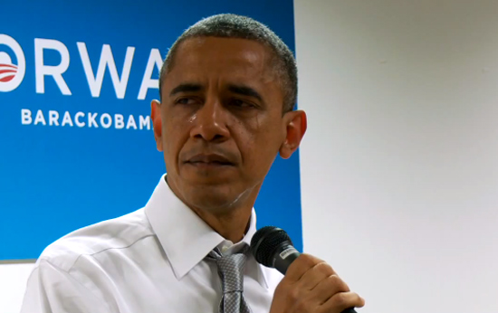 Ủy ban vận động tranh cử của Obama hôm 8/11 tải lên YouTube đoạn video cho thấy Tổng thống để lộ cảm xúc khi phát biểu cảm ơn các thành viên trong ủy ban bầu cử tại trụ sở ở Chicago. Đoạn video được ghi h́nh một ngày trước, chỉ vào giờ sau khi Obama tái đắc cử nhiệm kỳ thứ hai. "Những ǵ các bạn đă làm đă khiến công việc tôi đang làm trở nên quan trọng, tôi thực sự tự hào về điều đó, tôi thật sự tự hào về tất cả các bạn" - Obama nói trước khi dừng lại khi nước mắt lăn trên g̣ má ông - "Tôi hoàn toàn tin tưởng rằng tất cả các bạn sẽ làm được những điều hết sức tuyệt vời trong cuộc đời ḿnh".