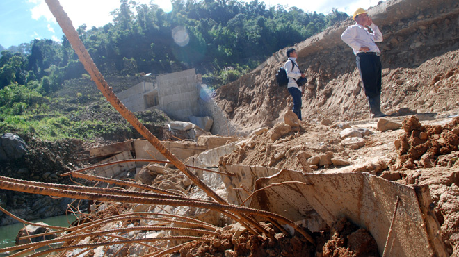 TT - Chuyện khó tin nhưng chủ đầu tư lại khẳng định đó là nguyên nhân khiến đập thủy điện dài 80m, cao 20m ở huyện Đăk Glei (Kon Tum) sụp đổ một đoạn 60m, làm một người chết.