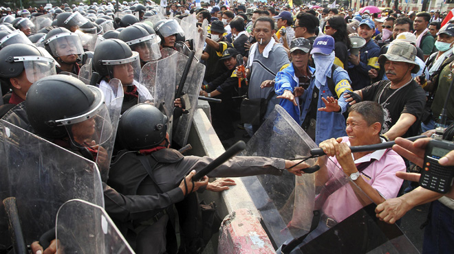 Người biểu t́nh đụng độ cảnh sát ở Bangkok hôm 24-11 - Ảnh: Reuters |