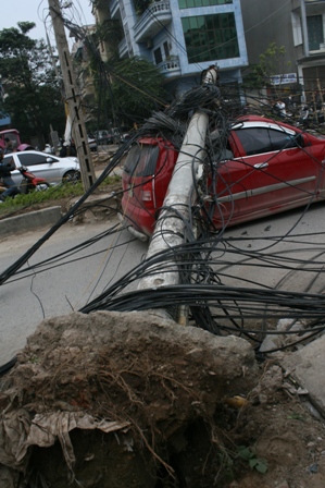 Hà Nội: Cột điện đè ô tô, tài xế thoát chết