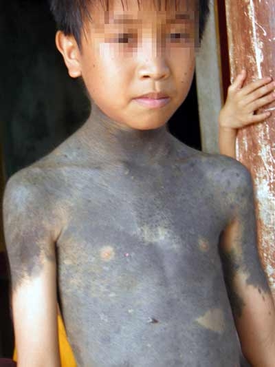 Lớp dày sừng da lòng bàn tay, chân tạo thành một bờ rõ nổi cao, thâm tím hoặc nổi sẩn đỏ 2 bên má, trán và các hội chứng dạ dày, tắc mật, hủy hoại tế bào gan. Cơ thể thường có biểu hiện mệt mỏi, chán ăn, buồn nôn, vàng da và rụng tóc.