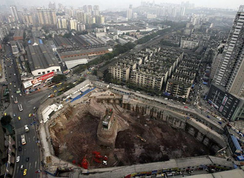 Mặc dù bị công ty xây dựng cắt điện, nước và đào đất sâu 10m xung quanh, gia chủ vẫn kiến quyết bám trụ tại căn nhà trơ trọi giữa công trường xây dựng. Ông chủ là Yang Wu, một nhà vô địch võ thuật, làm một chiếc thang dây để trèo lên phòng và dọa đánh bất kỳ người nào dám đuổi ông ta đi. Trong khi đó, người vợ là Wu Ping có kế hoạch mở một nhà hàng để kinh doanh ở tầng trệt ngôi nhà. Wu Ping thậm chí quảng cáo với truyền thông về ngôi nhà để gây áp lực với công ty xây dựng. Ngày 4/4/2007, sau quá trình đàm phán kéo dài, gia đình Wu chấp nhận chuyển đi vì được đền bù một căn hộ mới cùng khoản tiền đền bù một triệu NDT.
