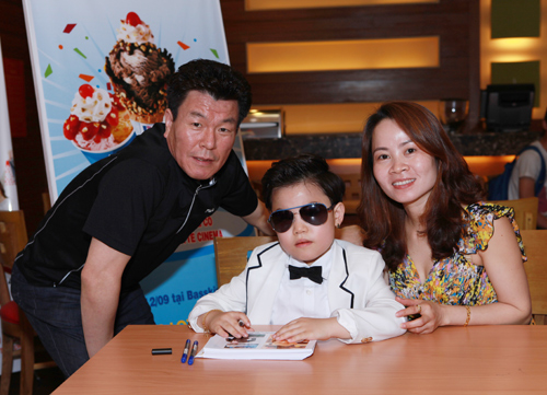 Psy nhí bên bàn ký tặng cùng với bố mẹ. Năm nay cậu bé đã được 7 tuổi và có công ty quản lý.