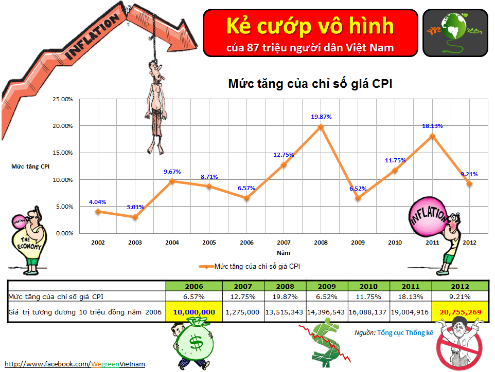 TRONG 6 NĂM (2006 – 2012), ĐỒNG TIỀN VIỆT NAM MẤT GIÁ HƠN 50%. Nói cách khác, hơn 50% tài sản của người dân được chôn dưới 3 tấc đất từ năm 2006 tới nay sau 6 năm đã bị bốc hơi đi hơn một nửa. Thật vô cùng khủng khiếp. Vậy AI LÀ THỦ PHẠM CƯỚP TIỀN của gần 90 triệu người dân Viêt Nam một cách tinh vi, trắng trợn và dã man đến vậy? Câu trả lời, đó chính là LẠM PHÁT, hệ quả của của sự gia tăng phi mã của giá thuốc, giá thực phẩm, giá dịch vụ giáo dục,…