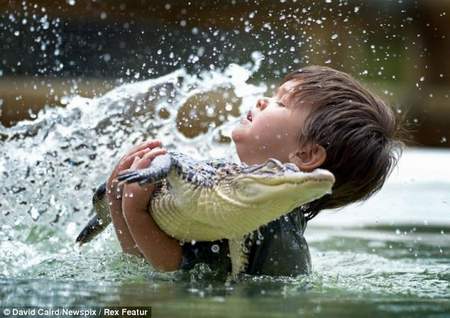 Bé trai 3 tuổi chơi đùa cùng cá sấu