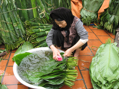 Cụ bà 78 tuổi này sinh ra trong gia đình có 4 đời làm nghề gói bánh chưng. Cụ cho biết khâu rửa lá rất quan trọng, lá sạch thì bánh mới ngon...