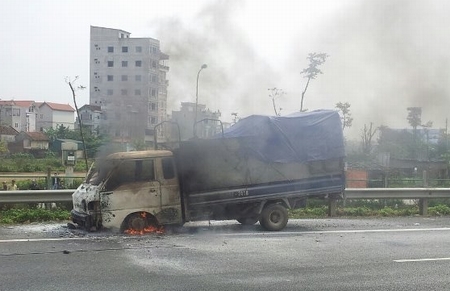Xe tải bỗng nhiên cháy dữ dội trên Đại lộ Thăng Long